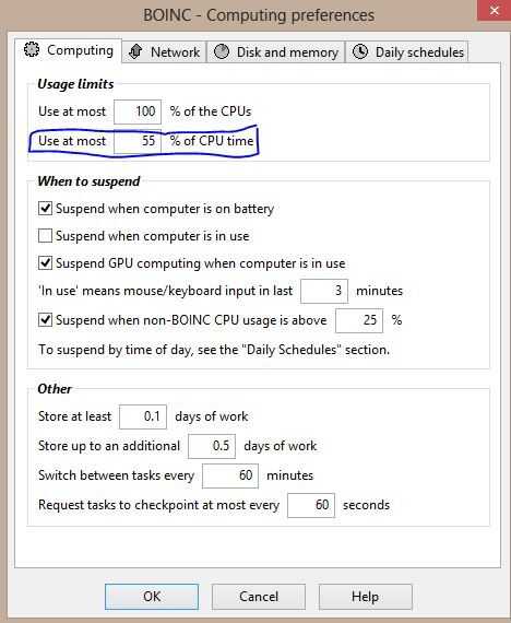 La mayoría de las opciones son auto explicativas, pero en la imagen de arriba se puede ver que he circundado uno. Esta opción limita la cantidad de los recursos de procesamiento puede utilizar BOINC en su procesador. Personalmente, me gusta que se limita a alrededor del 55% porque mi equipo es un umbral donde el ventilador funciona silenciosamente. Si dejas esta opción al 100%, su sistema de refrigeración será en su apogeo y puede ser ruidosa.