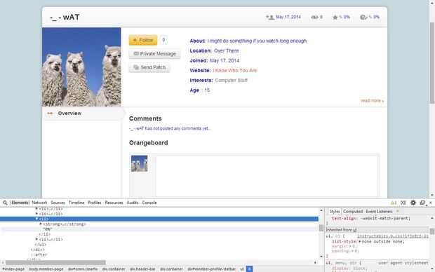 A lo que estamos trabajando, permite cambiar el texto. Digamos que usted tiene una cuenta baja de la característica. Por qué no cambiarla. Ir a los números de la cuenta de la característica (mina era 0%) y haga clic derecho y abrir el elemento de inspección. La pantalla de inspeccionar elemento entonces cambiará de puesto sobre otro código de sección que se verá algo como esto.