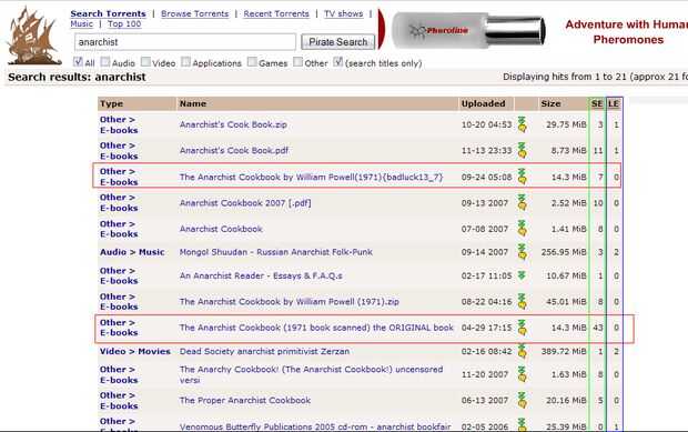El segundo torrent: el Cookbook del anarquista (libro de 1971 escaneado) el libro ORIGINAL tiene 43 semillas y 0 leechers, esto hace que el torrente de segundo su mejor opción. dclick el título torrents