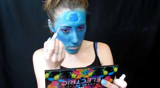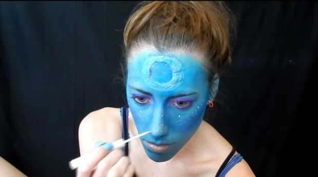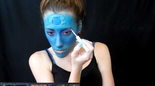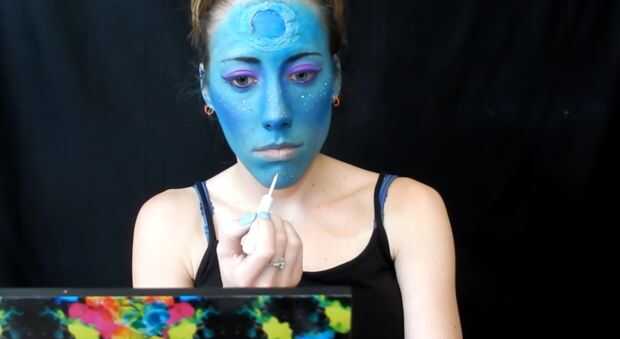 me pongo blush púrpura, luego he utilizado un delineador líquido blanco para poner puntos por todas partes.