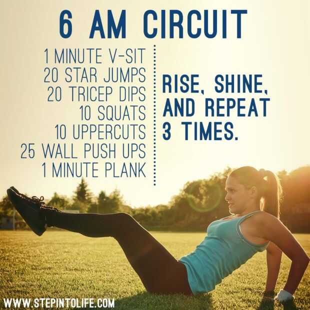 Trabajando es no estrictamente levantamiento de pesas. Yoga, correr o cualquier cosa que realmente obtiene el bombeo de sangre le ayudará a iniciar su día. Pruebe el circuito de 6:00, en la foto, un día. Después, evaluar cómo se siente comenzar su día con una rutina de ejercicios. Los resultados positivos de un entrenamiento por la mañana, superan con creces los negativos, y pronto usted ejercicio cinco días a la semana.