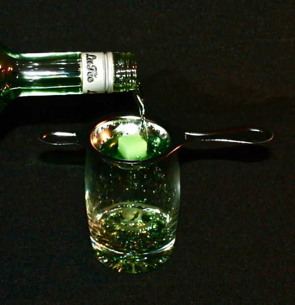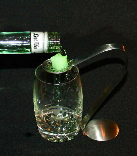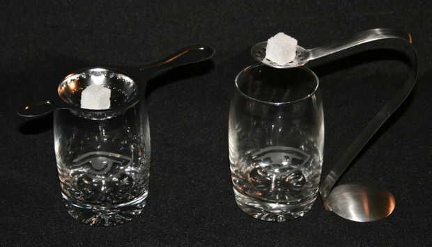 Coloque la espumadera sobre el vidrio, puso un cubo de azúcar y verter 1-2 tomas digno de absinth sobre él.