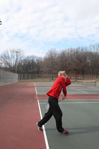 Levantar la raqueta hacia arriba y detrás de la cabeza. La cabeza de la raqueta debe estar detrás de la cabeza justo antes de que la bola alcanza su punto máximo. La bola alcanza su punto máximo, oscilación hacia arriba y hacia adelante para golpear la bola. El brazo debe ser totalmente recto al hacer contacto con la bola.
