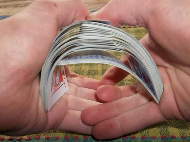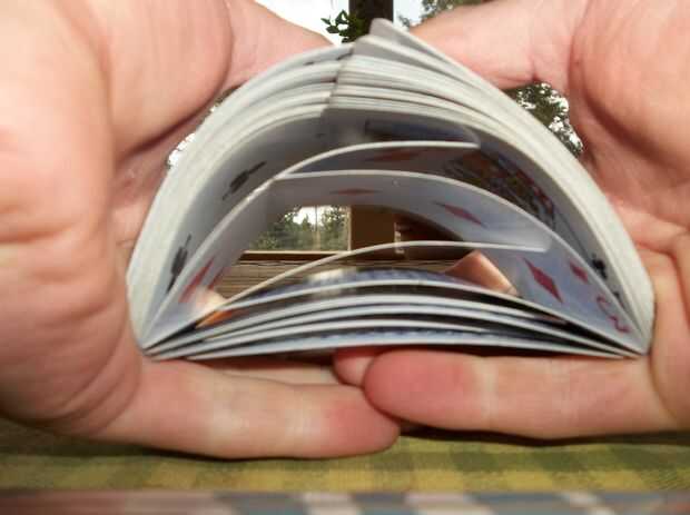 Ahora, con los 3 últimos dedos en el mismo lugar, de la curva la cosa entera en el medio, por lo que es un medio círculo. Coloque los pulgares en la parte superior para mantener las tarjetas desde el lanzamiento en la sala. Poner los dedos índice en la parte inferior, también. Cascada, suelte lentamente la presión, moviendo las manos ligeramente separadas. Plaza de la cubierta.