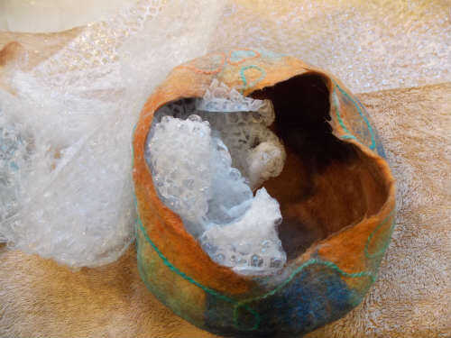 A continuación, desea la taza de la forma. Uso arrugó hasta el abrigo de burbuja comienzan trabajando vigorosamente el interior y fuera de su recipiente, formar como usted. Este endurecerá la fibra para que la taza no colapso. Es difícil decir cuánto tiempo le toma, usted podrá saber cuando la fibra es lo suficientemente fuerte como para soportar por sí mismo. Cuanto más tiempo se trabaja la fibra, más difícil se hace y cuanto más se contrae.