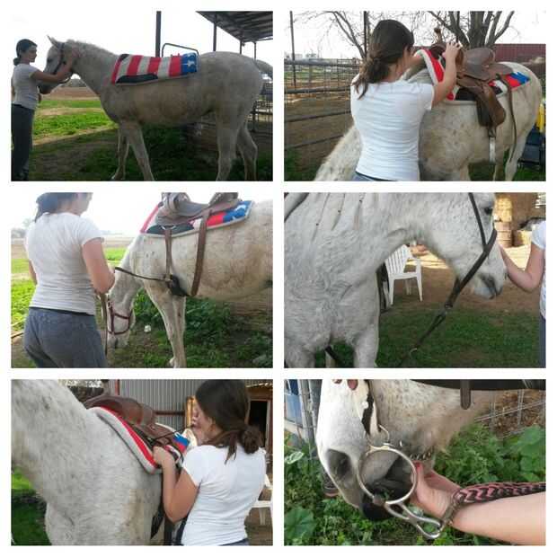 Después de cepillar y limpiar mi caballo me puse el cojín de la silla de montar del caballo. Siempre me aseguro que está cubriendo la Cruz y no frotar en mis caballos espaldas caderas. A continuación, colocar la silla de montar donde está en el centro de la almohadilla de silla de montar para equilibrar el peso en los caballos detrás. SIEMPRE puse un bolsillo entre mi cruz de caballos y el cojín de la silla de montar. Suficiente espacio para montar mi puño. Esto ayudará al caballo a sentirse más cómodo mientras que monta. Lo único que mantiene su silla de montar en su caballo es el juego de niños. Los lazos del metal en la parte inferior de la RCA será un poco del centro, esto es porque cuando usted apriete los lazos se muevan hacia el centro del estómago de los caballos. En primera deja la cincha floja si no se cincha frío su caballo. En segundo lugar al último puse el collar de la mama, que debe estar bien ajustado lo suficiente como para no caerse de los caballos del hombro puntos, esto puede causar que la manguera de tropezar y caer. Finalmente usted puede lentamente deslizar la brida a la cabeza de los caballos y la broca en su boca, sobre su lengua. Generalmente de clip las riendas en la brida antes de ponérselo pero esta parte no importa qué orden.