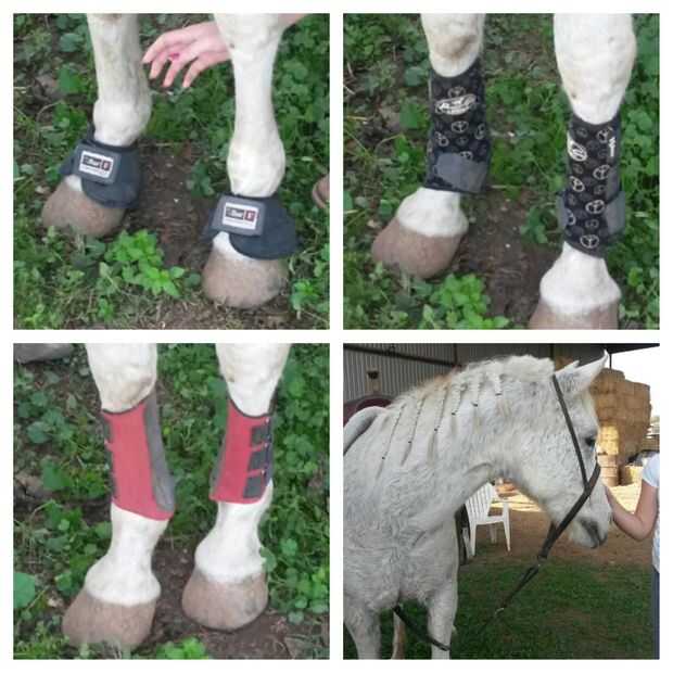 Botas de campana tienen una protuberancia que irá en la parte posterior de la pezuña de los caballos. Amarre va en la cabeza de caballos como una brida y luego los clips a la cincha. Cargadores de la tablilla tienen acolchado extra que irá en el interior de la pierna de caballos con el velcro hacia los caballos detrás las piernas. Combinación de las botas es como se ve en la imagen.