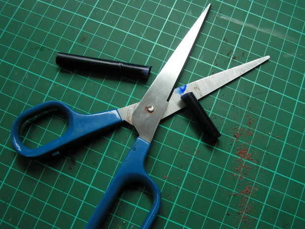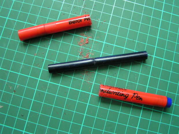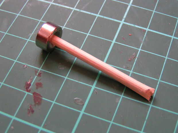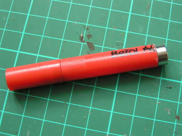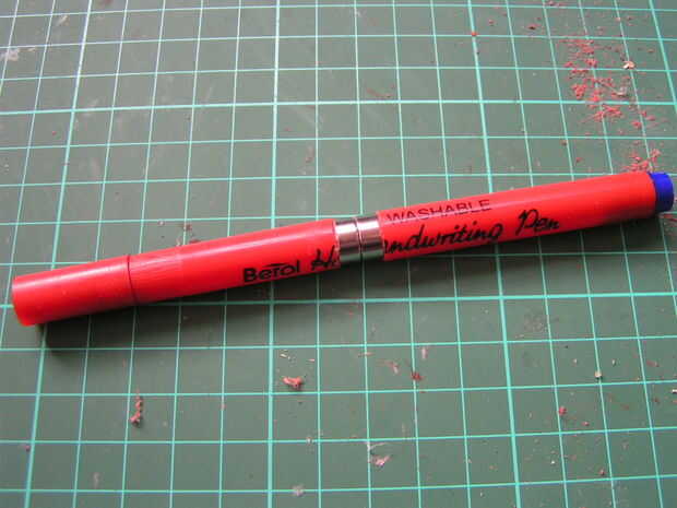 - Los imanes que tenía eran en hundido, así que me resbalé pedazos de bambú a través de los agujeros y en el eje de la pluma. Caliente-pegar el bambú en el eje de la pluma dio un empalme más fuerte que simplemente pegar el imán en el extremo.