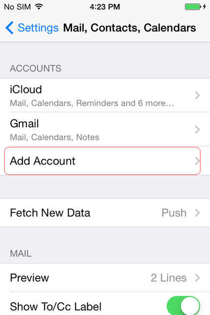 En Mail, contactos, interfaz de calendarios, la opción de añadir cuenta es justo en la parte superior. Toque agregar cuenta. Si ha activado calendarios al utilizar iCloud, se mostrará la cuenta de iCloud, pero todavía puede añadir otras cuentas.