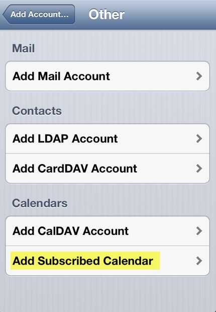 y pulse "Añadir cuenta...". Bajo calendarios, pulse "Añadir calendario suscrito"
