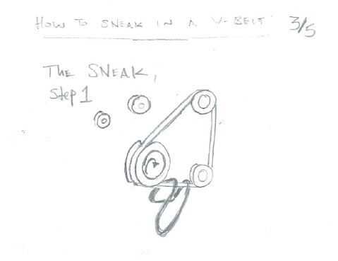 Con la correa vieja A fuera del camino, coloque uno nuevo (que tengo derecho?) como se muestra en la banda B. Usará el motor de arranque o algún músculo para mover un lado de la correa A alrededor de la polea, pero no el otro. ¿Cómo hacer la polea del cigüeñal gire un poco (digamos 90 grados o menos)? Puede aplicar una llave a la polea del cigüeñal, cualquier polea impulsada todavía por un cinturón, o usando el motor de arranque para arrancar el motor por una fracción de segundo. Haga lo que haga, mantenga los dedos fuera del camino.