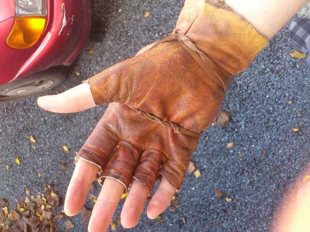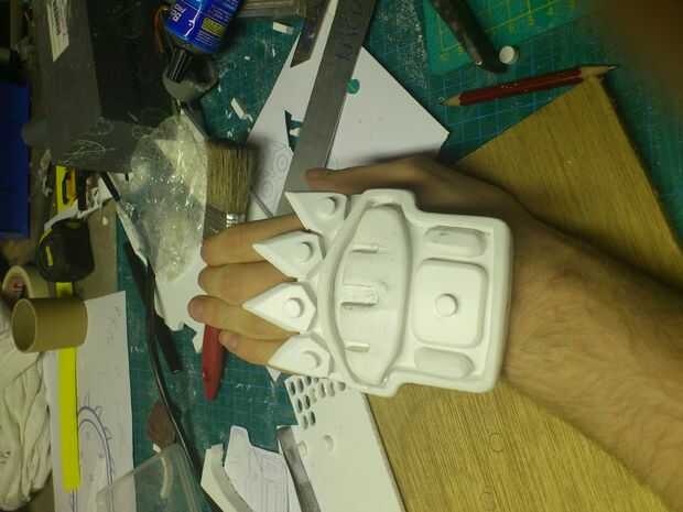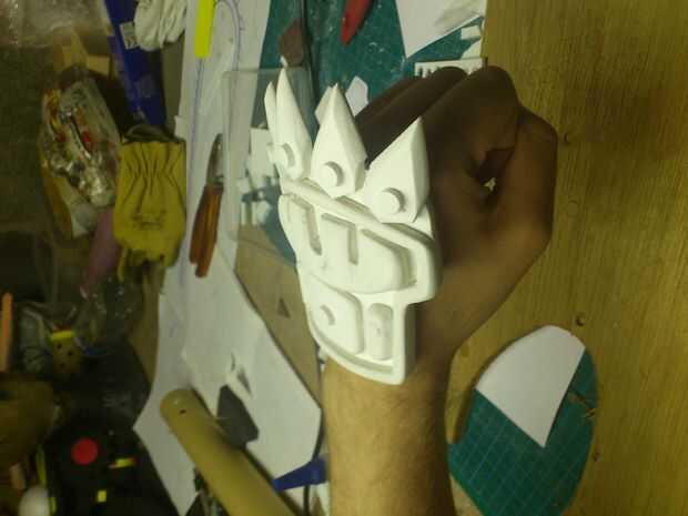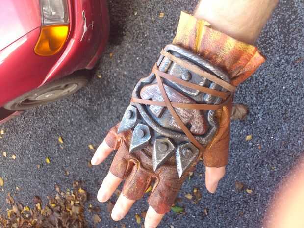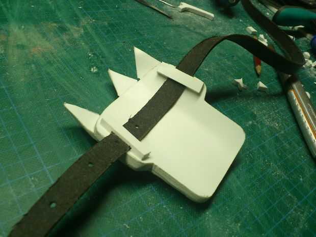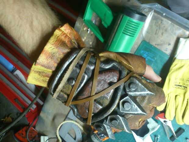 A guantes de arte, una vez más utilizo PVC expandido (ancho de 5mm), para la capa muy primera. Se añaden algunos detalles con thiner PVC (3mm). Para llegar a una capacidad más ofensiva, 4 puntos se agregan para aplastar cabezas sin esfuerzo. Pueden ser reafilada en cualquier momento. El guante entero se mantendrá por franjas de cuero.
