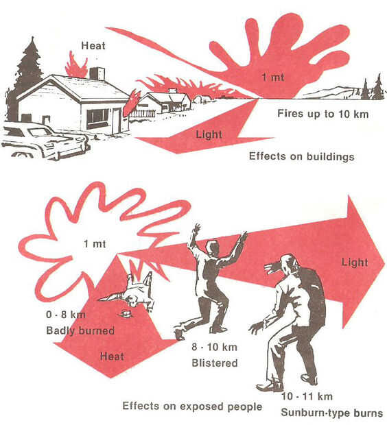 - Quemaduras tipo quemaduras ocurren hasta 11km (7 millas) de la explosión.
