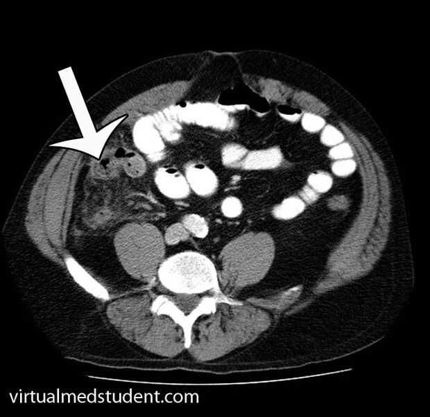 Cuando fui a la sala de emergencia, I descrito mis dolores de estómago al doctor, tiene una TC y muy rápidamente se le diagnosticó una ruptura del apéndice.