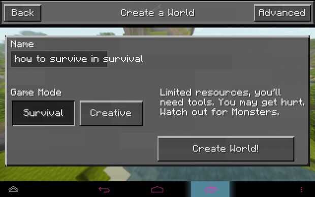 nueva de Minecraft? También mostraré cómo sobrevivir la primera noche en Minecraft.Paso 1: Crear un mundo. Cuando está creando un mapa de Minecraft no se olvide de seleccionar la supervivencia. Este modo es para aquellos de ustedes que estén interesa