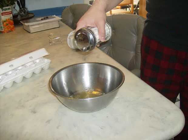 Romper los dos huevos y separar la yema de huevo con el blanco. Luego verter sobre 2 cucharaditas de azúcar. (No estoy seguro si el azúcar es importante. Yo uso azúcar durante la cocción para recetas comestibles.)