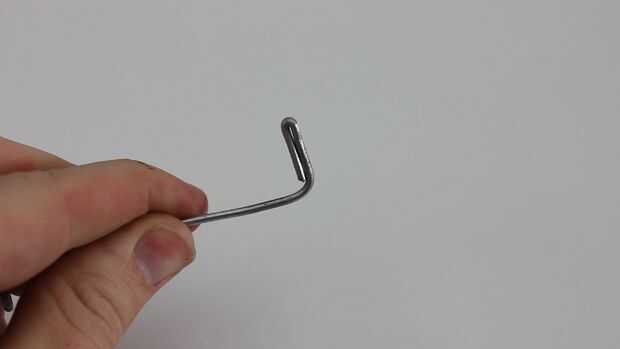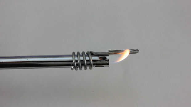 Se inclinó el extremo del alambre sobre. Este había duplicado el grosor de la punta. Entonces dobló el extremo del alambre en un ángulo de 90 grados. Esta forma de "L" hace más fácil conseguir una llama debajo de él.