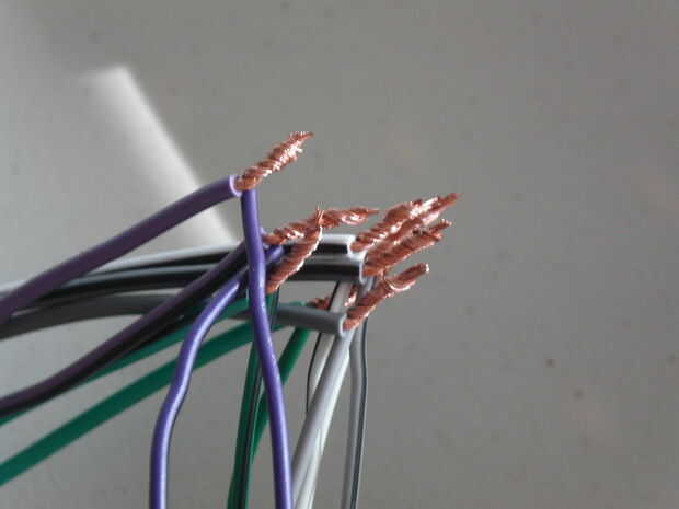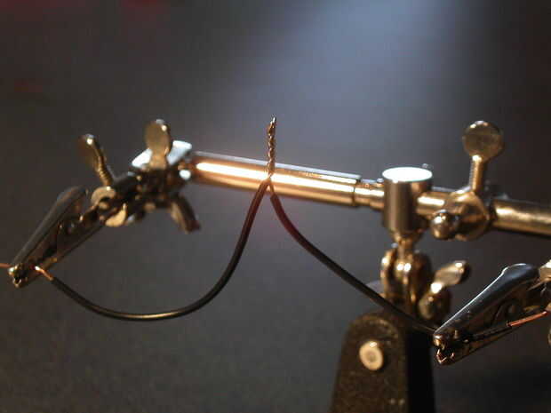 Pregunté a Mitch, un experto soldador que trabaja en la torre de control durante el día y es numberandom por la noche, para algunos consejos. Mitch me mostró una buena idea de cómo llevar a cabo la soldadura de alambre: se corta un pedazo de ella fuera el rollo y luego hace una bobina en un extremo con una ventaja corta en el otro. Esto le ayuda a mantenerla firme y aplicar la cantidad correcta de soldadura. Se trata de una manera mejor idea que tratar de mantener el carrete entero de la soldadura o agarrar en un filamento delgado.