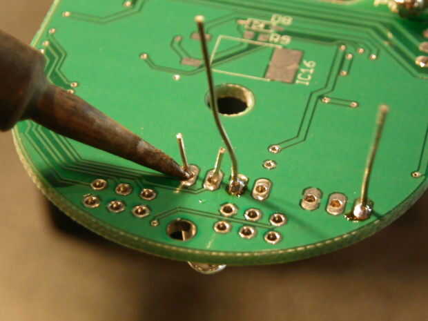 Soldadura en una placa de circuito tiene un poco más de cuidado y atención, pero todavía es muy factible. Empujé a algunos de los conductores de algunos LEDs y resistencias que tenía de mis LEDs para principiantes puesto a través de unos huecos abiertos en una placa de circuito que mentía alrededor de repuesto. Había soldado los cables en la parte inferior de la placa de circuito donde pasar los electrodos. Esto se llama a través del orificio de soldadura de componentes.
