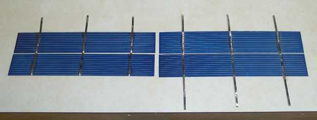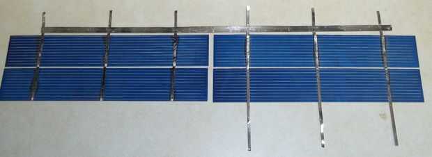 2. Ponga las cadenas al lado de uno con un pequeño espacio entre ellos. Recomiendo hacerlo en el vidrio que va a utilizar para el panel solar, o en algo que estas células pueden mantenerse en hasta que están listos para poner en un panel.