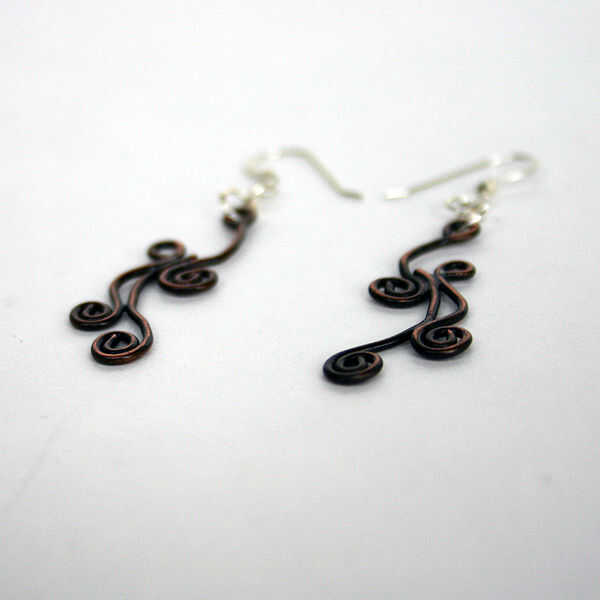 El cuadro en esta página es un par de aretes de alambre de cobre que sueldan juntos, entonces ennegrecido para ayudar a ocultar las costuras de soldadura. Cobre en su estado natural poco a poco manchar a un color marrón, pero si quieres mantenerlo brillante, rociarlo con laca clara o poliuretano. Plata también se empañan, pero es mucho más fácil pulir a plata brillante por lo que generalmente no uso laca sobre ella.