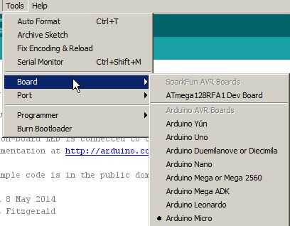 Seleccione del menú superior herramientas adecuada Junta Directiva, en nuestro caso Arduino Micro.
