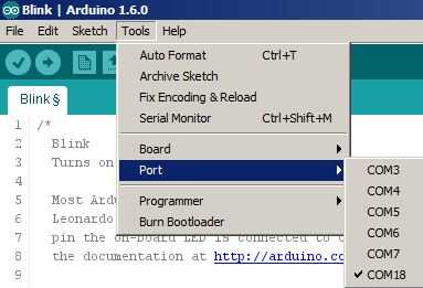Seleccione Puerto serie adecuado de la herramientas del menú superior.