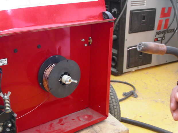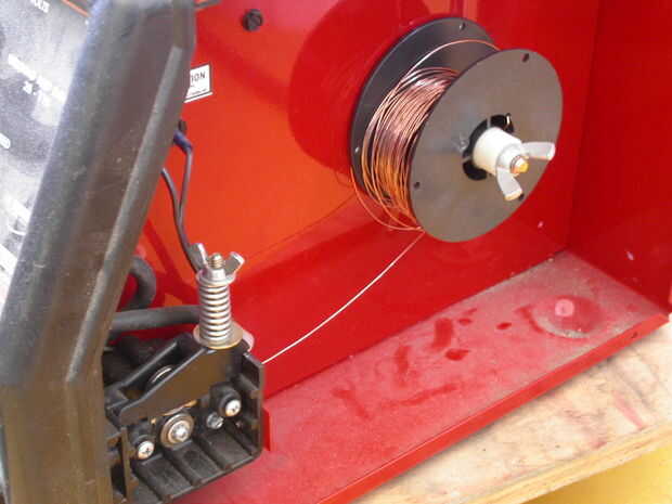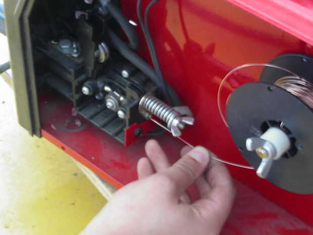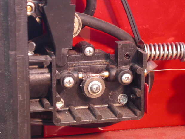 6. (foto 6) - elimine los pliegues el cable y alimentación en los rodillos. Para ello en algunas máquinas que se debe soltar el muelle de tensión manteniendo los rodillos apretados en los cables. Perno de tracción en la foto a continuación. Es el resorte con la tuerca de mariposa en la en su posición horizontal (desactivado).