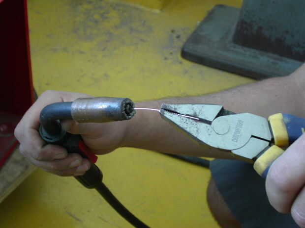 4. (foto 4) - tomar las pinzas y sacar todo el alambre de la manguera a través de la punta de la pistola.