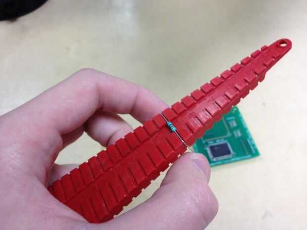 Mientras uno de los conductores del componente sostiene con pinzas o con un "árbol de Navidad", como se muestra, presione suavemente el cuerpo del componente hasta que el cable está doblado en un ángulo de 90 grados. Repita para el otro cable. (Los videos de estas técnicas pueden encontrarse en http://www.solder.net/technical-info/soldering-tips/.