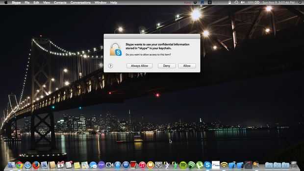 Sidenote1: Skype también tendrán un aviso de notificación para permitir iniciar Skype, cada vez que las conexiones que tengas el firewall activado en preferencias del sistema. La única manera de solucionar este problema es desactivar el firewall. Si usted necesita mantener cortafuegos, todavía obtendrás el símbolo del sistema cada vez, pero uno es obviamente mejor que 7.