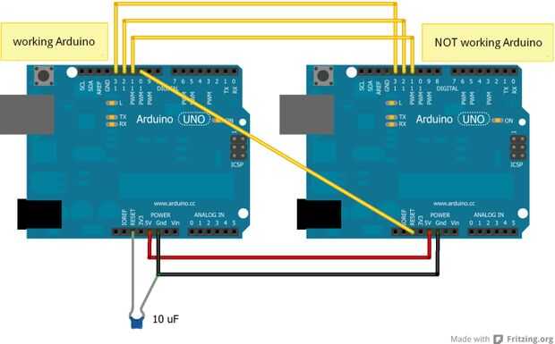 Conecte un condensador de 10 uF entre reset y en el funcionamiento de Arduino.