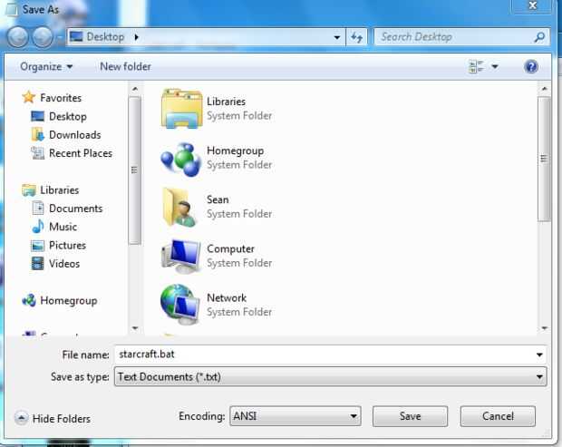 Y guárdelo como Starcraft.bat (las cuatro líneas). Asegúrese de no poner starcraft.bat.txt. Ahora haga doble clic en el archivo .bat.
