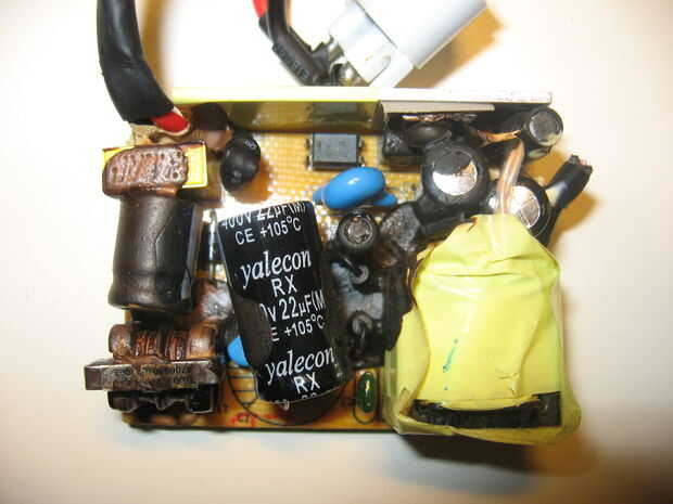 El caso del sheevaplug puede abrirse mediante la eliminación de los topes de 4 caucho, debajo de los pies es un tornillo con cabeza Philips. Me sacó la fuente vieja y lo llevé aparte a ver lo que pasó.