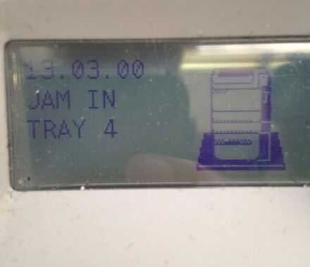 Atascos de la bandeja (como se muestra) se producen cuando se atasca papel dentro de la bandeja de papel. Utilice la pantalla para localizar el atasco, luego continúe al siguiente paso.