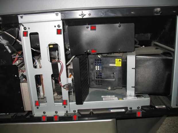 Esta fotografía muestra a la derecha la mitad de la TV cuando se mira desde atrás. Los 2 tornillos en la pieza negra flexible en la parte superior derecha deben quitarse para que el cable en el paso 3 se puede quitar fácilmente. Saldrá el soporte metálico cerca del centro de la TV, pero el interruptor todavía se unirá, así que me recosté con cuidado contra las entradas de AV.
