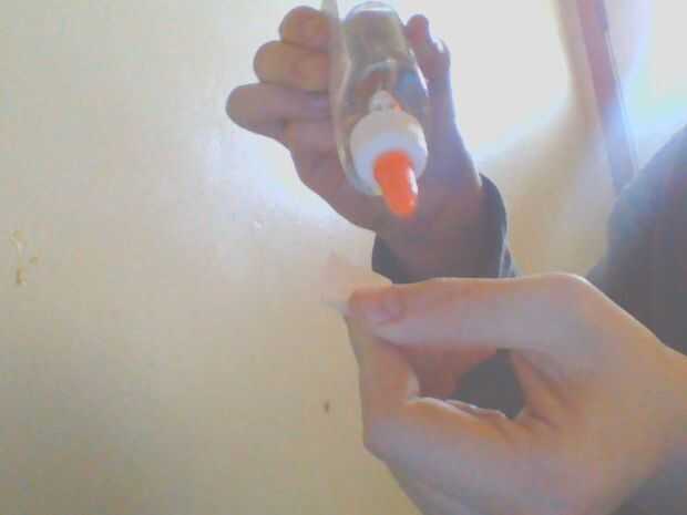 Tomar un pedazo de papel y corte/corte un trozo pequeño que puede caber en el agujero y virutas. cuando tengas tu papel toma su cola y saturarla, asegurándose de que a ambos los lados mojados.
