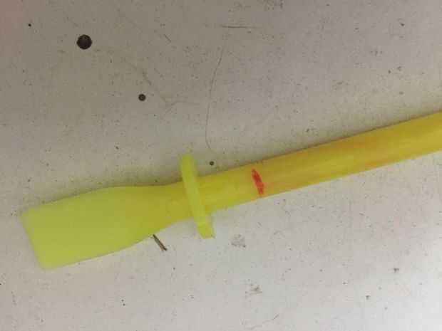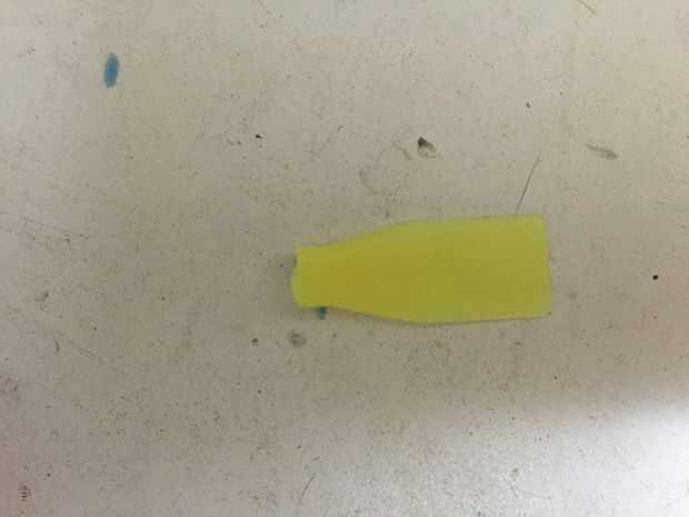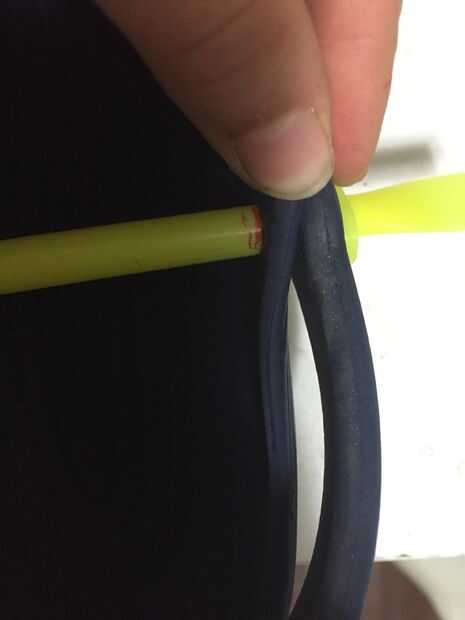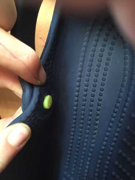 El siguiente paso es marcar donde se corte el separador. Para ello que simplemente tienes que pasar a través de ambos agujeros de la croc y la correa de la croc y luego marcarlo un poco más allá de donde encuentra el borde del interior de la croc. Corte la parte marcada (ver segunda imagen) luego corte la parte que se separa (ver última foto).