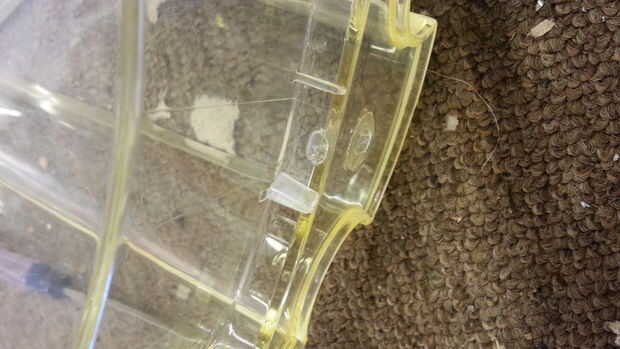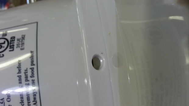 Primero tengo que averiguar cuál es el problema. Esto es bastante fácil de hacer si usted tiene conocimientos generales de los aparatos y cómo está construidos. El problema con este es que la pequeña pieza de plástico que empuja un interruptor de seguridad se rompió en el colector de pulpa. En la imagen pueden ver la pieza rota poniendo a la izquierda en el envase.