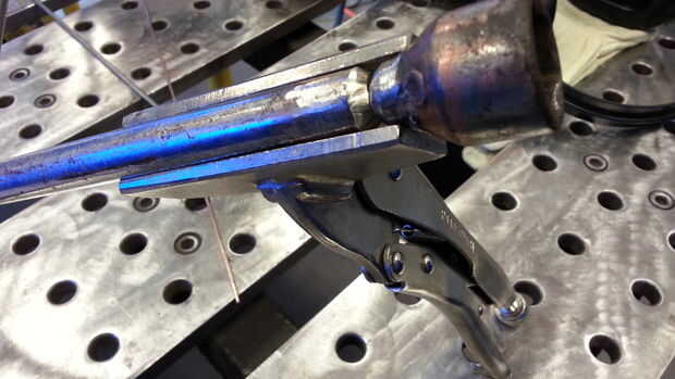 Fije las dos piezas que vas a soldar con un vice grip. Utilizamos un agarre de tornillo mordaza plana que fue capaz de sostener la llanta hierro y toma la cabeza en línea recta con los demás.