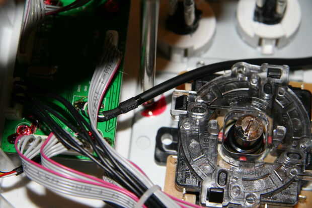 A continuación, vas tener que desconecte la palanca del cable de su adjunto a. Suena fácil, pero Madcatz lo ha pegado en su lugar. Usé un cuchillo para cortar el pegamento y levante la conexión floja. Esto tomó un poco de hacer, y no desea tire demasiado en nada, así que Tómese su tiempo y tener cuidado. Basta con ejecutar la hoja a lo largo de la costura en la parte superior, y cuando se pone profunda que tienes algunos aproveche, haga palanca suavemente. En el otro lado de la conexión, hay un poco de un corchete cosa - sólo cortar y palanca.