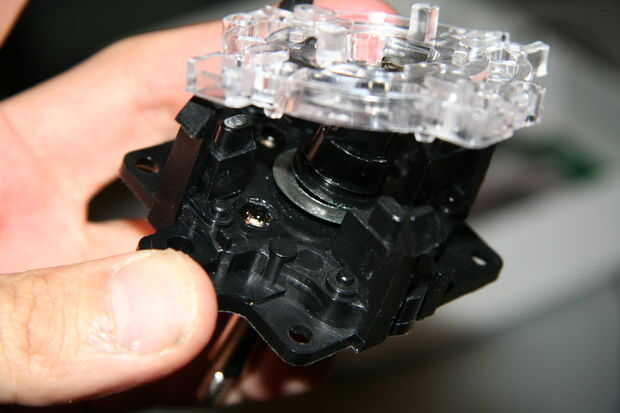 El quid de todo este problema es una arandela pequeña. La lavadora parece estar ahí para que la cosita de plástico que mantiene el resorte en su lugar tiene una superficie de metal, en lugar de un plástico uno, a tope para arriba contra. En teoría, es grande. En la práctica, es un error fatal. Como puede ver en la foto, cuando usted mantenga presionado el stick hacia un lado, la lavadora comienza un poco. Esto es lo que está comiendo su PCB. Esto es lo que está causando el palo al "palo" en una dirección.