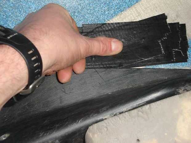 Para una buena reparación, se debe utilizar cerca de cinco o seis tiras de cinta, cada uno levemente compensan, y cada uno calienta y presiona en el kayak.
