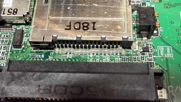 2. se desea agregar pasta de flujo para las 4 patas del lector de tarjetas y todos los pernos en la parte posterior del lector de tarjetas
