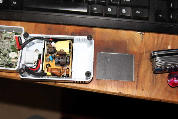 básicamente salí a buscar un barato como posible solución para conseguir la sheeva en línea.El caso del sheevaplug puede abrirse mediante la eliminación de los topes de 4 caucho, debajo de los pies es un tornillo con cabeza Philips. Me sacó la fuente