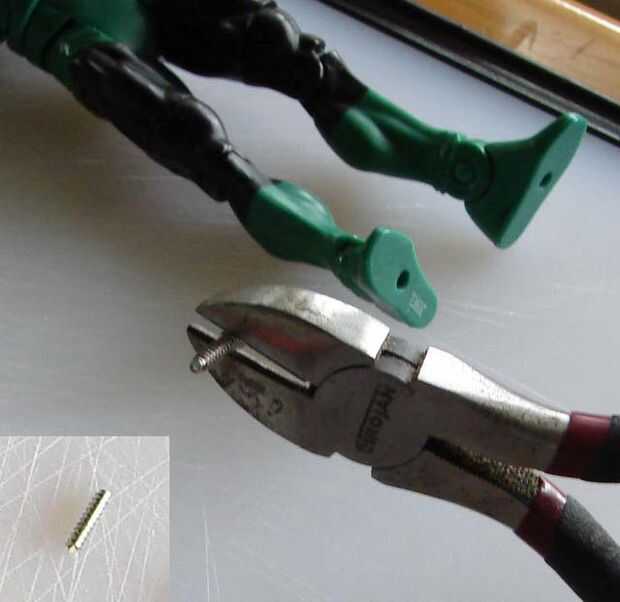 Empleando una sierra para metales o fresas (yo usé ambos), quitar la cabeza del perno. La longitud requerida depende de hasta qué punto puede atornillar el tornillo en su figura de acción sin el perno obstruir otros movimientos.