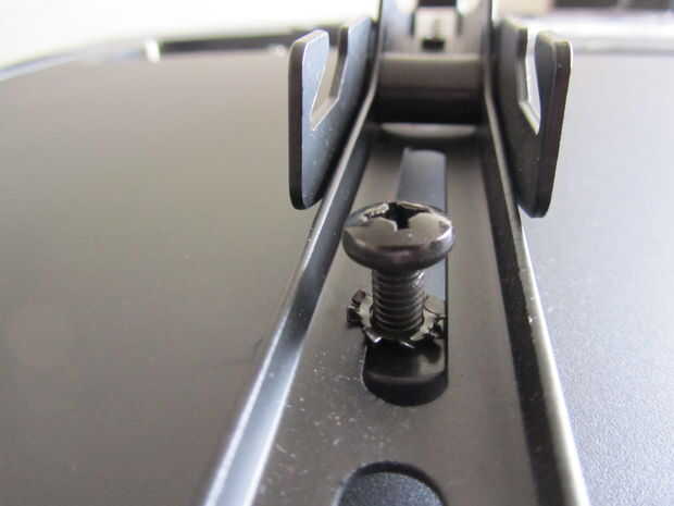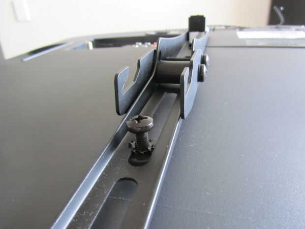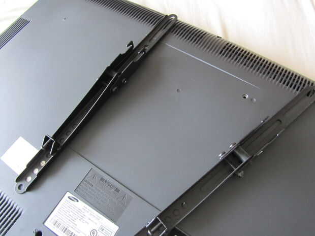 Coloque los brazos en la parte posterior de su televisor en cualquier forma tiene más sentido para usted. Para evitar el deslizamiento, estaba cuidado de usar uno de los orificios individuales en la parte inferior, pero que no pudo trabajar en su situación. Puede experimentar con un par de opciones en este momento y decidir lo que funciona mejor para usted.