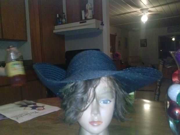 Esto será fácil y pueden ver no el viejo sombrero de cuero marrón que usa. Esta había vendida desde el ejército de salvación. Ser un redondo, sombrero de ala ancha de las señoras por $4. La primera foto es con la parte posterior cubrió así que vosotros todavía un poco pueden ver el sombrero del estilo de las señoras. La siguiente fotografía se showin frente casi hecho y luego sobre el pelo. Barato y fácil.