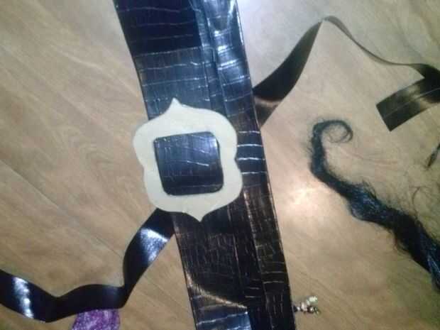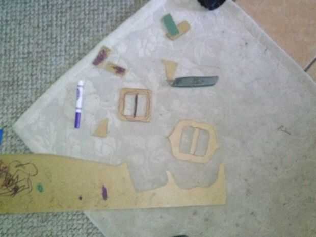 Esto ser el paso que cuestan más. Sobre todo porque no ser havin cualquier cinturones aquí que trabajan y las hebillas eran todos pequeñas. Exploré todo para Cinturones baratos y grandes hebillas pero fue en vano. Acabé de trueque el material para las correas se ($15 para el gran y cerca de $12 para el fino) y había hecho las hebillas de una vieja parte inferior del cajón del aparador. Saqué los patrones en papel, luego los copié a la parte inferior del cajón. Usé una caja-cuchillo o navaja hobby o cuchillo de bota para cortar los patrones. Luego rocía con pintura de aerosol de cobre amarillo rustoleum. Para la correa del tahalí, yo sólo había cosido la hebilla en el material. El "Sun Belt" se hizo en una correa regulable, casi real. Para el titular de la espada en el cinturón de tahalí me sólo cosido dos bucles en un pedazo de viejo cuero (a partir de un casco viejo de la bolsa/bombardero previamente) y luego había cosido ese pedazo a la correa.