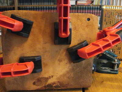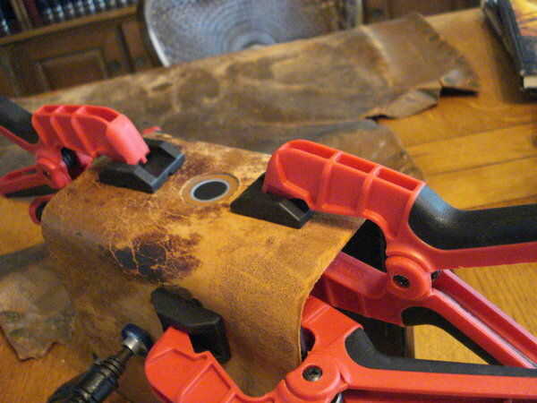Ahora es el momento para iniciar la acción de pegar... Comience con la espina dorsal del libro, haciendo que el agujero para el botón del LED esté centrado. Después de darle algún tiempo para ajustar (Lea cuidadosamente las instrucciones de su pegamento preferido) puede soltar las abrazaderas y empezar a pegar por los lados. Utilicé una perforadora para los agujeros en el cuero donde los tornillos caso ir - pero habría utilizado algún equipo más apropiado si había encontrado en mi sala de costura de las madres...